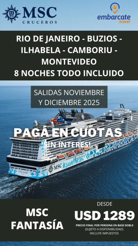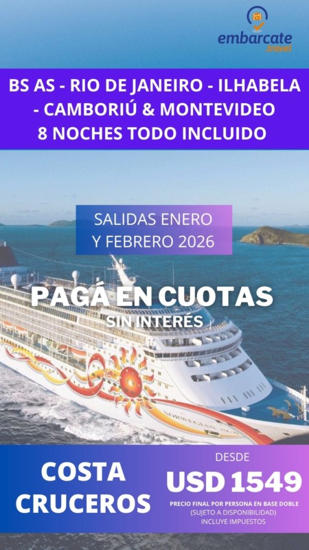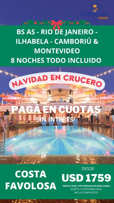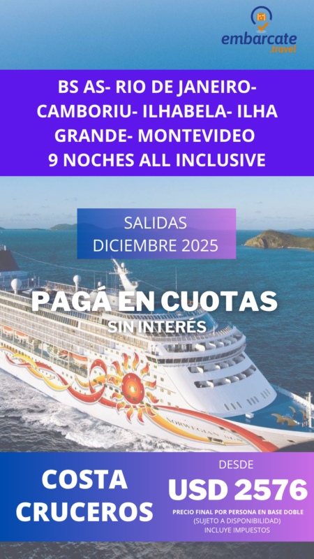 Costa Cruceros – Bs. As., Camboriu, Ilhabela, Ilha Grande, y Montevideo – 9 noches – Año nuevo 2025/2026 MÁS INFO