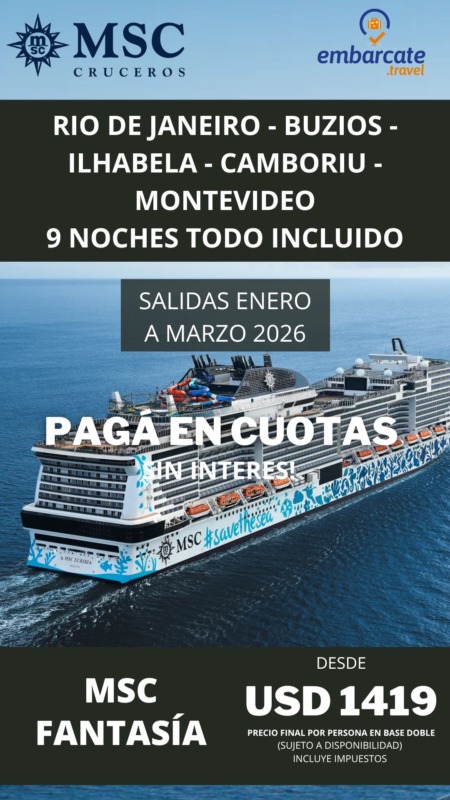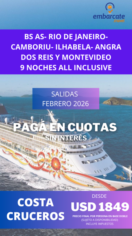 Costa Cruceros – Bs. As., Rio de Janeiro, Camboriu, Ilhabela, Angra dos Reís y Montevideo- 9 noches- Febrero 2026 MÁS INFO