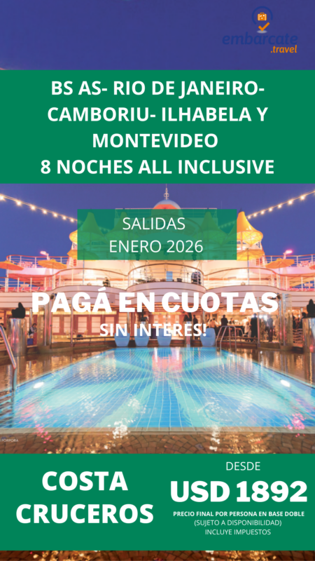 Costa Cruceros – Bs. As., Rio de Janeiro, Camboriu, Ilhabela y Montevideo- 8 noches- Enero 2026 MÁS INFO