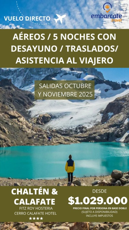 Alojamiento: 5 noches en Fitz Roy Hostería en El Chaltén, y Cerro Calafate Hotel en Calafate.